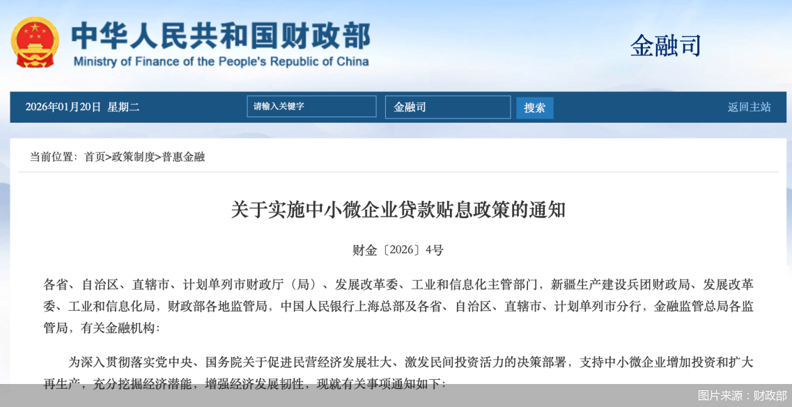 北京商报讯(记者 董晗萱)中小微企业贷款也有真金白银支持!1月20日,财政部等部门连发多条通知,在优化个人消费贷款、经营贷贴息政策的同时,明 确实施中小微企业贷款贴息政策。 政策要求,对2026年1月1日起经办银行发放的、符合条件的中小微民营企业固定资产贷款和中小微民营企业参与项目使用的新型政策性金融工具资金,中央 财政按照贷款本金给予年化1.5个百分点、期限不超过2年的贴息支持,单户贴息贷款规模上限5000万元。政策实施期限暂定1年,后续可视情况延长。 适用对象为,投向相关重点领域产业链及其上下游产业的全部中小微民营企业(包括但不限于由支持小微企业融资协调工作机制推荐或由工业和信息化部共 享的优质中小微民营企业)固定资产贷款,中小微民营企业参与项目使用的新型政策性金融工具资金。 投向领域包括,支持新能源汽车、工业母机、医药工业、医疗装备、基础软件和工业软件、民用大飞机、服务器、移动通信设备、新型显示、仪器仪表、工 业机器人、轨道交通装备、船舶与海洋工程装备、农机装备等相关重点产业链及上下游产业,科技服务、物流服务、信息和软件服务、节能环保服务、生产 性租赁服务、商务服务等生产性服务业领域,农、林、牧、渔、农 ...