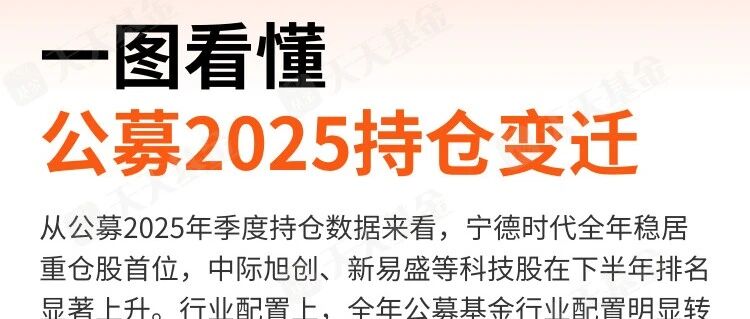 1 大大基金 | 链接您与财富 | 基金前十大重仓行业变化 行业投资市值(亿元) | | 202501 | 202502 | 2025Q3 | 202504 | | --- | --- | --- | --- | --- | | 1 | 电子 | 电子 | 电子 | 电子 | | | 5189 | 5318 | 8541 | 7745 | | 2 | 食品饮料 | 医药生物 | 医药生物 | 电力设备 | | | 3039 | 3195 | 4213 | 3775 | | 3 | 医药管物 | 电力设备 | 电力设备 | 通信 | | | 2892 | 2571 | 4191 | 3576 | | ব | 电力设备 | 食品饮料 | 非银金融 | 医药生物 | | | 2768 | 2533 | 2968 | 3459 | 图看懂 公募2025持仓变迁 从公募2025年季度持仓数据来看,宁德时代全年稳居 重仓股首位,中际旭创、新易盛等科技股在下半年排名 显著上升。行业配置上,全年公募基金行业配置明显转 向,从传统消费、金融板块切换至科技成长板块。 | 基金前十大重仓股变化 持股市值(亿元) | | 20250 ...