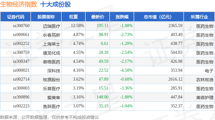 证券之星消息,11月21日,生物经济(970038)指数报收于2111.48点,跌2.26%,成交191.14亿元,换手 率1.64%。当日该指数成份股中,上涨的有1家,普洛药业以1.41%的涨幅领涨,下跌的有49家,我武生 物以5.0%的跌幅领跌。 生物经济(970038)指数十大成份股详情如下: | 证券代码 | 股票简称 | 权重 | 最新价 | 涨跌幅 | 总市值(亿元) | 所属行业 | | --- | --- | --- | --- | --- | --- | --- | | sz300760 | 迈瑞医疗 | 12.58% | 195.11 | -1.88% | 2365.59 | r 医药生物 | | sz000661 | 长春高新 | 4.87% | 98.91 | -2.73% | 403.49 | 医药生物 | | sz002252 | 十麻奥士 | 4.74% | 6.61 | -1.20% | 438.77 | 医药生物 | | sz300759 | 康龙化成 | 4.55% | 28.39 | -2.54% | 504.83 | 医药生物 | | sz300347 | 泰格医药 | ...