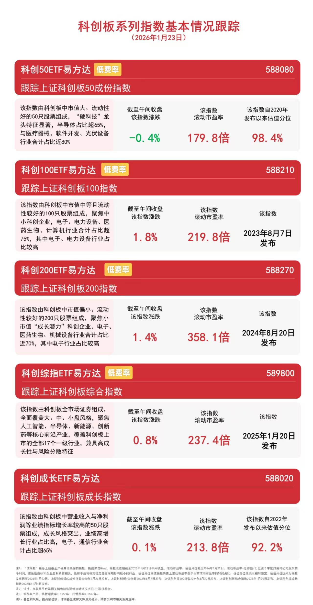 截至午间收盘,科创100指数上涨1.8%,科创200指数上涨1.4%,科创综指上涨0.8%,科创成长指数上涨0.1%,科创50指数下跌0.4%。Wind数据显示,科创 50ETF易方达(588080)2025年跟踪误差仅为0.26%,同期超额收益达0.66%、居同类可比产品第一。 科创50ETF易方达 低费率 跟踪上证科创板50成份指数 | 该指数由科创板中市值大、流动性 | 截至午间收盘 | 该指数 | 该指数自 | | --- | --- | --- | --- | | 好的50只股票组成, "硬科技"龙 | 该指数涨跌 | 滚动市盈率 | 发布以来 | | 头特征显著,半导体占比超65%, | | | | | 与医疗器械、软件开发、光伏设备 | -0. 4% | 179.8倍 | 98. | | 行业合计占比近80% | | | | 科创100ETF易方达 (FF F22 跟踪上证科创板100指数 该指数由科创板中市值中等且流动 性较好的100只股票组成,聚焦中 小科创企业,电子、电力设备、医 药生物、计算机行业合计占比超 75%,其中电子、电力设备行业占 比较高 | 截至午间收盘 | 该指数 | 该排 ...