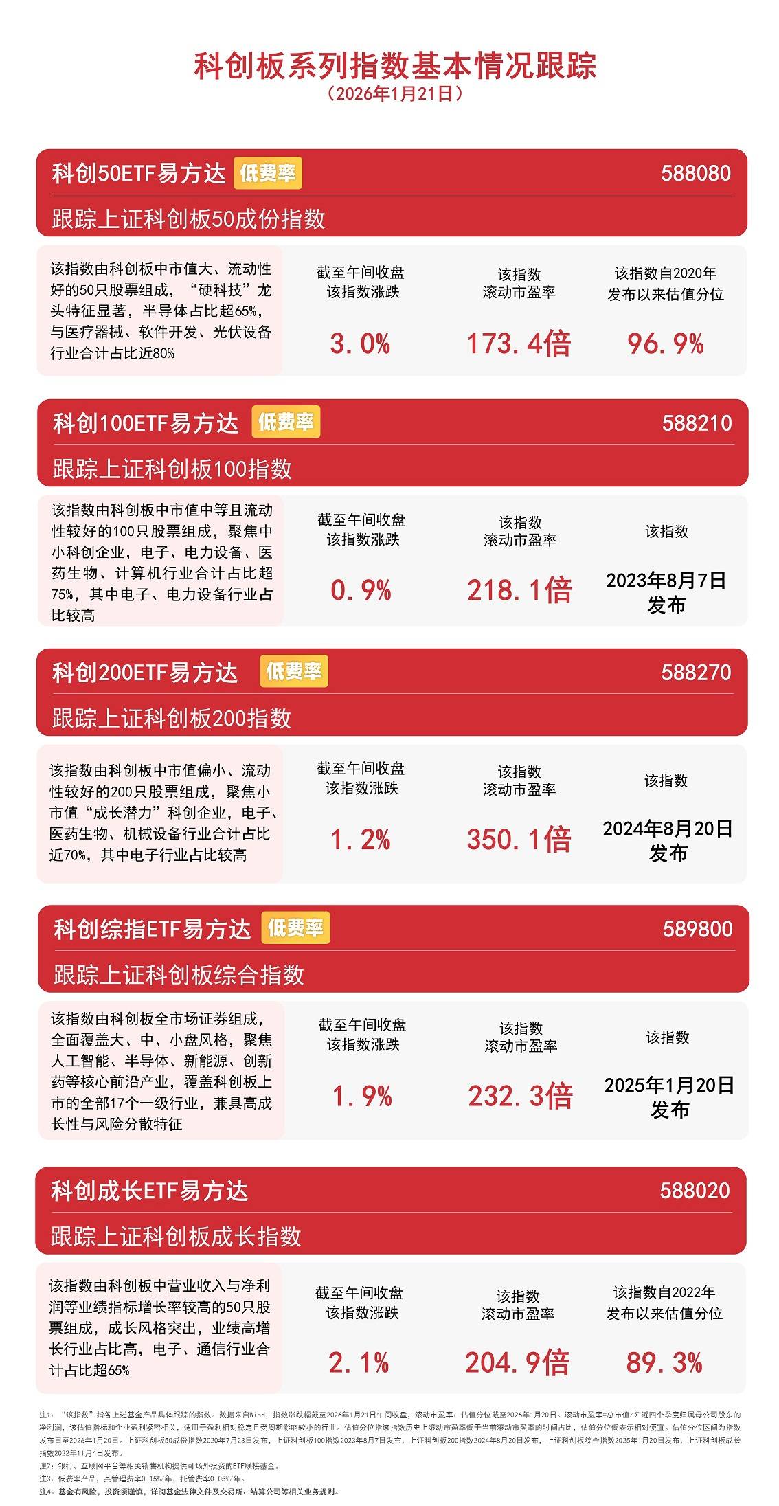 截至收盘,创业板中盘200指数、创业板成长指数均上涨0.6%,创业板指数上涨0.5%。 工信部今日表示,近年来,一批"含新量"高的创新成果竞相涌现。实验室里的"好点子"源源不断转化为生产线上的"好产品"。钙钛矿材料、永磁材料、动力 电池等技术处于国际先进水平,新型网络、高速通信、先进计算、新兴软件、区块链等技术加快迭代,基于新型量子技术的原子钟、磁力仪等样机研制成 功,超导量子计算机、光量子计算机实现量子优越性。 1乡指数 创业板成长ETF易方达 跟踪创业板成长指数 该指数由创业板中成长风格突 出、业绩增长较高、预期盈利 较好、流动性好的50只股票组 成,通信、电力设备、电子、 计算机、医药生物行业合计占 比近85% 该指数; 0-6 注1:"该指数"指各上述基金产品具体跟踪的指数。数据来自Wind,指数涨跌幅截至2026年1月21日4 润,该估值指标和企业盈利紧密相关,适用于盈利相对稳定且受周期影响较小的行业。估值分位指该打 日至2026年1月20日。创业板指数2010年6月1日发布,创业板中盘200指数2023年11月15日发布,创业材 注2:银行、互联网平台等相关销售机构提供可场外投资的ETF联接基金。 ...