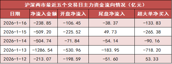 1月16日,A股市场整体下跌。截至收盘,上证指数收报4101.91点,下跌0.26%;深证成指收报14281.08点,下跌 0.18%;创业板指收报3361.02点,下跌0.2%。两市合计成交30262.32亿元,较上一交易日增加1207.36亿元。 1.两市主力资金净流出近240亿元 今日沪深两市主力资金开盘净流出106.45亿元,尾盘净流出38.37亿元,全天净流出238.85亿元。 | | | 沪深两市最近五个交易日主力资金流向情况(亿元) | | | | --- | --- | --- | --- | --- | | 日期 | | 净流入金额 开盘净流入 | 尾盘净流入 | 超大单净买入 | | 2026-1-16 | -238.85 | -106. 45 | -38. 37 | -133. 83 | | 2026-1-15 | -509.20 | -225.52 | 49.73 | -265. 38 | | 2026-1-14 | -504.74 | -71.84 | -54. 14 | -90. 16 | | 2026-1-13 | -1286.54 | -530. 96 | -183. 95 | ...