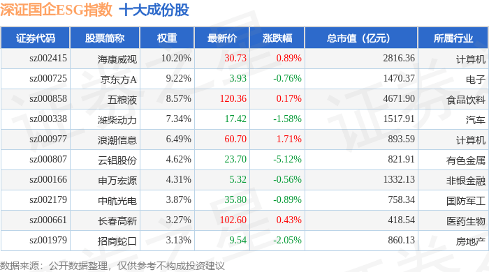 证券之星消息,11月18日,深证国企ESG(970055)指数报收于1382.09点,跌0.8%,成交272.88亿元,换手率1.05%。当日该指数成份股中,上 涨的有15家,浪潮信息以1.71%的涨幅领涨,下跌的有35家,中来股份以7.27%的跌幅领跌。 深证国企ESG(970055)指数十大成份股详情如下: | 证券代码 | 股票简称 | 权重 | 最新价 | 涨跌幅 | 总市值(亿元) | | 所属行业 | | --- | --- | --- | --- | --- | --- | --- | --- | | sz002415 | 海康威视 | 10.20% | 30.73 | 0.89% | | 2816.36 | 计算机 | | sz000725 | 京东方A | 9.22% | 3.93 | -0.76% | | 1470.37 | ● 电子 | | sz000858 | 五根液 | 8.57% | 120.36 | 0.17% | | 4671.90 | 食品饮料 | | sz000338 | 潍柴动力 | 7.34% | 17.42 | -1.58% | | 1517.91 | 汽车 | | ...