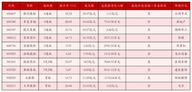 二、强势概念板块 根据A股概念涨跌幅与所对应的股票池综合分析,涨幅靠前的三个概念板块分别为:小红书概念、拼多 多概念与Sora概念(文生视频)。排名前10位的概念板块相关数据见下表: 一、强势个股 截至11月18日收盘,上证综指下跌0.81%,收于3939.81点,深证成指下跌0.92%,收于13080.49点,创 业板指下跌1.16%,收于3069.22点。今日沪深两市A股共计63只涨停,综合当前连板数以及当日龙虎榜 数据,其中较为强势的前三只个股分别为:胜利股份(000407)、华夏幸福(600340)与航天发展 (000547)。今日强势个股前10位具体数据见下表: | 代码 | 简称 | 造板数 | 换手率(%) | 成交额 | 龙虎持净买入额 | 最高价是否创一年来新高 | 所属行业 | | --- | --- | --- | --- | --- | --- | --- | --- | | 000407 | 胜利股份 | 6连板 | 32.52 | 19.07亿元 | 1.11亿元 | 是 | 公用事 不 | | 600340 | 华夏幸福 | 4连板 | 28.89 | 34.66亿元 | 751 ...