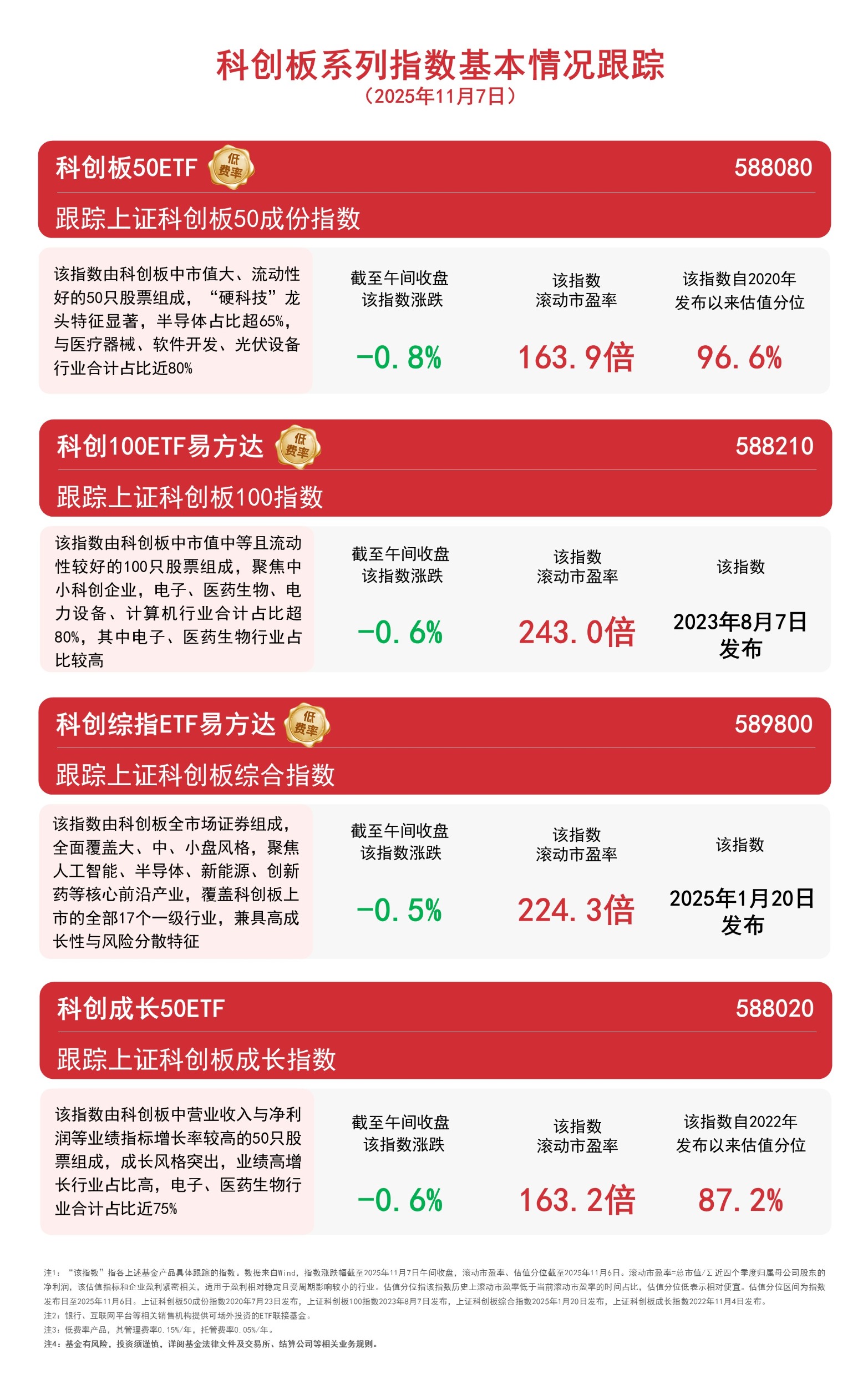 截至午间收盘,科创综指下跌0.5%,科创100指数、科创成长指数均下跌0.6%,科创板50指数下跌0.8%,相关产品近日受市场关注。Wind数据显示,科创板 50ETF(588080)最新规模达736亿元,在科创板相关ETF中居前。 科创板系列指数基本情况 (2025年11月7日) 科创板50ETF 跟踪上证科创板50成份指数 该指数由科创板中市值大、流动性 好的50只股票组成,"硬科技"龙 头特征显著,半导体占比超65%, 与医疗器械、软件开发、光伏设备 行业合计占比近80% | | 该指数 滚动市盈率 110 | | --- | --- | | 截至午间收盘 该指数涨跌 AAI | | 跟踪上证科创板100指数 该指数由科创板中市值中等且流动 性较好的100只股票组成,聚焦中 小科创企业,电子、医药生物、电 力设备、计算机行业合计占比超 80%,其中电子、医药生物行业占 比较高 | 截至午间收盘 | 该指数 | | --- | --- | | 该指数涨跌 | 滚动市盈2 | -0. 6% 243.0 科创综指ETF易方达 跟踪上证科创板综合指数 0. 8% 163. 9' 科创100ETF易方达 (文章来 ...