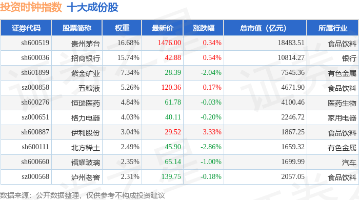 证券之星消息,11月18日,投资时钟(399391)指数报收于3379.42点,跌0.59%,成交749.0亿元,换 手率0.83%。当日该指数成份股中,上涨的有15家,伊利股份以3.33%的涨幅领涨,下跌的有83家,潞 安环能以5.6%的跌幅领跌。 投资时钟(399391)指数十大成份股详情如下: | 投资时钟指数 十大成份股 | | --- | | 证券代码 | 股票简称 | 权重 | 最新价 | 涨跌幅 | 总市值(亿元) | | 所属行业 | | --- | --- | --- | --- | --- | --- | --- | --- | | sh600519 | 贵州茅台 | 16.68% | 1476.00 | 0.34% | | 18483.51 | 食品饮料 | | sh600036 | 招商银行 | 15.74% | 42.88 | 0.54% | | 10814.27 | ● 银行 | | sh601899 | 紫金矿业 | 7.34% | 28.39 | -2.04% | 4 | 7545.36 | 有色金属 | | sz000858 | 五粮液 | 5.26% | 120.36 | ...