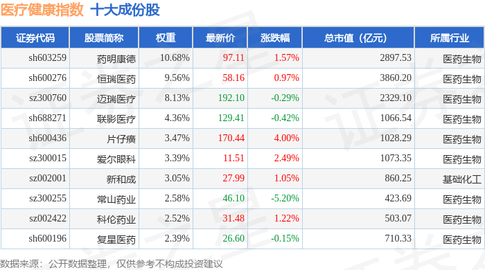 证券之星消息,2月5日,医疗健康(980016)指数报收于6134.0点,涨0.33%,成交272.21亿元,换手率 1.04%。当日该指数成份股中,上涨的有27家,片仔癀以4.0%的涨幅领涨,下跌的有23家,常山药业以 5.2%的跌幅领跌。 医疗健康(980016)指数十大成份股详情如下: | 医疗健康指数 十大成份股 | | --- | | 证券代码 | 股票简称 | 权重 | 最新价 | 涨跌幅 | 总市值(亿元) | 所属行业 | | --- | --- | --- | --- | --- | --- | --- | | sh603259 | 药明康德 | 10.68% | 97.11 | 1.57% | 2897.53 | 医药生物 | | sh600276 | 恒瑞医药 | 9.56% | 58.16 | 0.97% | 3860.20 | 医药生物 | | sz300760 | 迈瑞医疗 | 8.13% | 192.10 | -0.29% | 2329.10 | 医药生物 | | sh688271 | 联影医疗 | 4.36% | 129.41 | -0.42% S | 1066.54 | 医药 ...