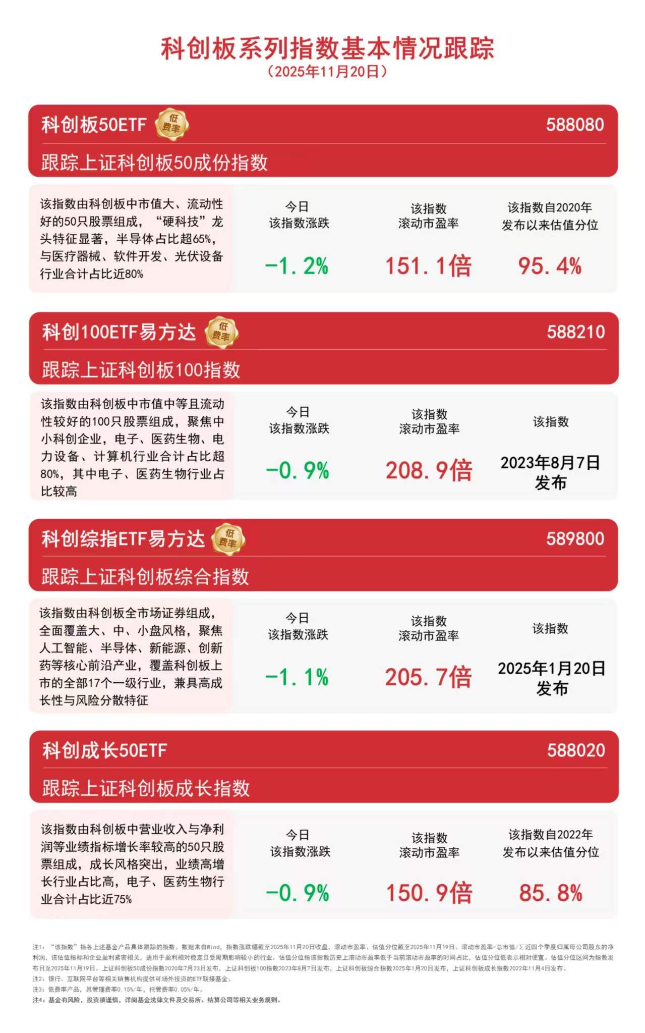今日科技成长板块集体回调,半导体、OCS等AI硬件方向部分个股活跃,锂电池、光伏等新能源赛道集体下挫。截至收盘,科创100指数、科创成长指 数均下跌0.9%,科创综指下跌1.1%,科创板50指数下跌1.2%。相关产品近期受资金关注,其中科创板50ETF(588080)昨日净流入约1亿元。 科创板系列指数基本情况跟踪 (2025年11月20日) 科创板50ETF ( 跟踪上证科创板50成份指数 该指数由科创板中市值大、流动性 好的50只股票组成,"硬科技"龙 头特征显著,半导体占比超65%, 与医疗器械、软件开发、光伏设备 行业合计占比近80% 科创100ETF易方达 跟踪上证科创板100指数 该指数由科创板中市值中等且流动 性较好的100只股票组成,聚焦中 小科创企业,电子、医药生物、电 力设备、计算机行业合计占比超 80%,其中电子、医药生物行业占 比较高 �日 该指数 该指数涨跌 滚动市盈率 208. 9倍 -0. 9% 科创综指ETF易方达( 跟踪上证科创板综合指数 该指数由科创板全市场证券组成, 全面覆盖大、中、小盘风格,聚焦 人工智能、半导体、新能源、创新 药等核心前沿产业,覆盖科创板上 市的全部1 ...
