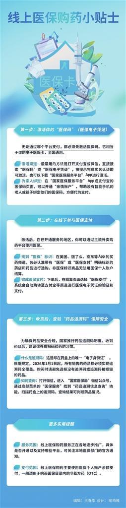 (来源:中国改革报) 转自:中国改革报 线上医保购药小贴士 0 第一步:激活你的"医保利"(医保电子凭证) 无论通过哪个平台支付,都必须先激活医保码。它相当 于你的电子匯保卡,全国通用。 2 激活调道:最常用的方法是打开支付宝或微信,直接搜 索"医保码"或"医保电子凭证",按提示完成实名认证即 可激活。也可以下载"国家区保服务平台"App进行激活。 = 为家人绑定:在"国家医保服务平台"App或支付宝的 匯保码资面,可以开通"亲情账户",帮助没有智能手机的 老人或孩子绑定他们的医保码,方便代为支付。 第二步:在线下单与医保支付 第三步:收费后,查验"药品追测码"保障安全 为确保药品安全合规,国家推行药品追溯码制度。收到 药品后,建议你养成扫码给药的习惯。 1 什么是追测码:这是印在药盒上的唯一"电子身份证" 粗显规定,2026年1月1日起,所有铜售的药品都必须实现追 测码全覆盖。购买时请避免选择没有追溯码或追测码被损毁 的药品。 = 如何查询:打开微信,进入"国家医保局"教信公众号, 通过庭部菜单的"医保服务"找到"药品滤测信息查询"功 能。扫描药盒上的追测码,查询结果可判断药品情况。 更多实用提醒 = 服务 ...