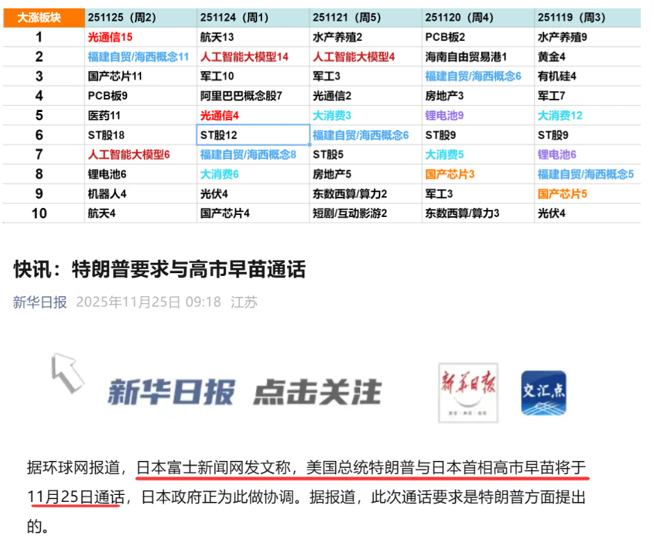 11月25日,市场震荡拉升,创业板一度涨超3%,午后创业板指与深成指均遭遇一定程度的回落,最终三大指数均未能有效站稳于5日 线之上,截至收盘,沪指涨0.87%,深成指涨1.53%,创业板指涨1.77%。沪深两市成交额1.81万亿,较上一个交易日放量844亿。 个股层面来看,今日短线情绪进一步修复,连续两日逾百股涨超9%,跌停个股数量降至5家。 | 大涨板块 | 251125 (周2) | 251124 (周1) | 251121 (周5) | 251120 (周4) | 251119 (周3) | | --- | --- | --- | --- | --- | --- | | 1 | 光通信15 | 航天13 | 水产养殖2 | PCB板2 | 水产养殖9 | | 2 | 福建自贸/海西概念11 | 人工智能大模型14 | 人工智能大模型4 | 海南自由贸易港1 | 黄金4 | | 3 | 国产芯片11 | 幸工10 | 室工3 | 福建自贸/海西概念6 | 有机硅4 | | प | PCB板9 | 阿里巴巴概念股7 | 光通信2 | 房地产3 | 军工7 | | 5 | 医药11 | 光通信4 | 大消费8 ...