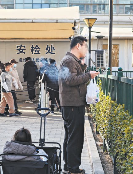 首都医科大学附属北京儿童医院东门安检处北侧,一名男子正在吸烟。 2024年1月12日,本报以《有人在妇幼医院"喷云吐雾"》为题,反映了本市多家儿童专科医院及妇幼保 健医院存在吸烟问题。近日,记者先后多次走访发现,医院内吸烟现象已经减少,但医院门口吸烟者众 多。市民呼吁加大监督提醒力度,在进出医院通道等区域打造无烟环境。 2月24日上午9点左右,记者来到首都医科大学附属北京儿童医院东门,刺鼻的烟味扑面而来。两名男子 站在南侧入口处,一口接一口地吐出烟雾。在他们面前,不时有家长带着孩子走过。记者观察发现,门 口吸烟者络绎不绝,最多时有5名男子同时吸烟,烟味非常呛人。"从这儿进出医院,烟味想躲都躲不过 去。"家长赵女士说,孩子本来就咳嗽,闻到烟味更难受。 2月5日上午,记者曾来这里探访,看到保洁人员胸前佩戴着"控烟监督员"标识,在安检处周围打扫卫 生。"这边不让吸烟,但我也只能劝,别人听不听,那就不好说了。"保洁人员大多时候只是用眼神警告 吸烟者,发现对方还在吸,也没多说什么,低下头接着捡灌木丛里的烟头。他告诉记者,自己每天至少 能捡几十个烟头。 在首都医科大学附属首都儿童医学中心,院内多处可见"您已进入无烟医院, ...
