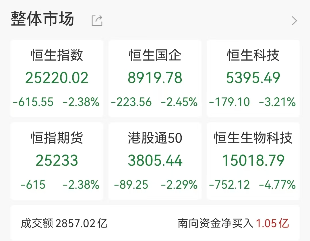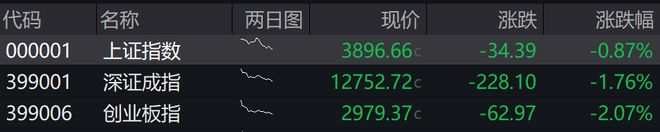 09:21 港股开盘丨恒生指数低开1.45% 恒生指数低开1.45%,恒生科技指数跌2.21%。科网股全线回调,百度集团、腾讯音乐、哔哩哔哩跌逾 4%。半导体概念表现不振,中芯国际、华虹半导体跌超3%。 | HSTECH | 恒生科技 | m | 5451.51 c | -123.08 | -2.21% | | --- | --- | --- | --- | --- | --- | | મટા | 恒生指数 | W | 25460.42c | -375.15 | -1.45% | 09:25 A股开盘丨三大指数集体低开 上证指数跌0.87%,深成指跌1.76%,创业板指跌2.07%。全市场下跌个股超4800只。 | 代码 | 名称 | 两日图 | 现价 | 涨跌 | 涨跌幅 | | --- | --- | --- | --- | --- | --- | | 000001 | 上证指数 | 20 | 3896.66c | -34.39 | -0.87% | | 399001 | 深证成指 | 5 | 12752.72c | -228.10 | -1.76% | | 399006 | 创业板指 | ma | 29 ...