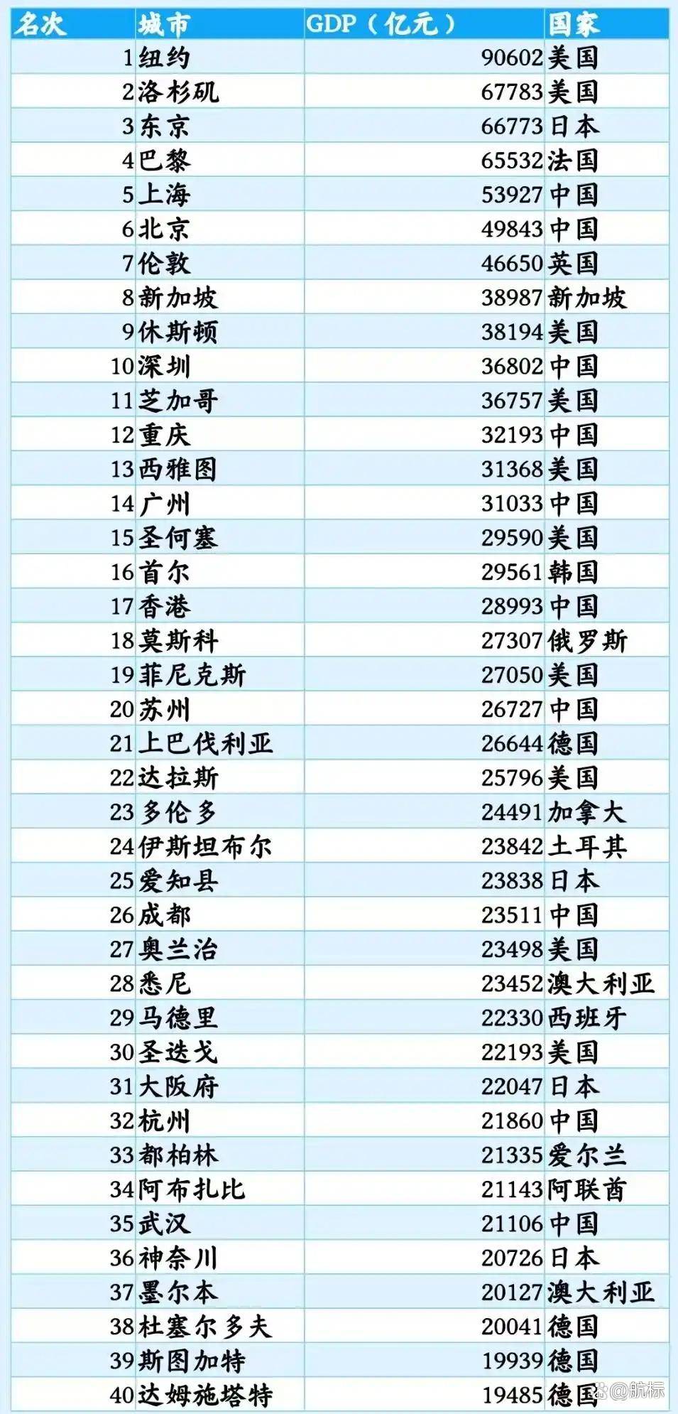 | 名次 | 城市 | GDP (亿元) 国家 | | --- | --- | --- | | | 1纽约 | 90602美国 | | | 2洛杉矶 | 67783美国 | | | 3 东京 | 66773日本 | | | 4巴黎 | 65532法国 | | | 5 上海 | 53927中国 | | | 6北京 | 49843 中国 | | | 7伦敦 | 46650英国 | | | 8新加坡 | 38987 新加坡 | | | 9休斯顿 | 38194美国 | | | 10深圳 | 36802中国 | | | 11芝加哥 | 36757美国 | | | 12重庆 | 32193中国 | | | 13 西雅图 | 31368美国 | | | 14 广州 | 31033中国 | | | 15 圣何塞 | 29590美国 | | | 16 首尔 | 29561 韩国 | | | 17 查港 | 28993中国 | | | 18莫斯科 | 27307俄罗斯 | | | 19菲尼克斯 | 27050美国 | | | 20 苏州 | 26727中国 | | | 21上巴伐利亚 | 26644 德国 | | | 22达拉 ...