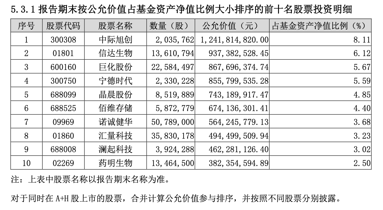 1月22日,公募基金2025年四季报披露完毕。公募基金最新前十大重仓股出炉,分别是中际旭创、新易 盛、宁德时代、腾讯控股、紫金矿业、阿里巴巴-W、寒武纪、立讯精密、贵州茅台、东山精密。与 2025年三季度末相比,寒武纪、东山精密新进公募基金前十大重仓股,工业富联、中芯国际退出前十大 重仓股。 中际旭创成为公募基金2025年四季度增持市值最多股票,增持市值为226.02亿元。此外,中际旭创已经 连续三个季度位列公募基金增持市值最多的股票。除科技股外,有色、化工、电气设备板块个股也得到 了基金经理的大手笔增持。 ● 本报记者 万宇 张凌之 中际旭创登顶 根据天相投顾提供的数据,2025年四季度末,中际旭创取代宁德时代成为公募基金第一大重仓股,公募 基金持有市值达784.21亿元。 积极拥抱AI 2025年,人工智能(AI)成为A股市场最强主线之一。2025年四季度,基金经理调仓换股力度较大,积 极拥抱AI。 以知名基金经理陈皓管理的易方达科翔为例,该基金2025年四季度重仓的AI相关板块贡献显著,截至 2025年四季度末,该基金前十大重仓股包括中际旭创、新易盛等多只AI概念股。 刘玉管理的广发新兴成长混合前十大重 ...