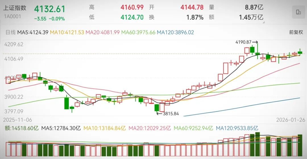 今日A股市场略显沉闷。上证指数微跌0.09%报4132.61点,深证成指跌0.85%报14316.64点,创业板指跌0.91%报3319.15点。沪深京三市全天成交额达3.52 万亿元,较前一交易日放量超5000亿元,但资金集中流向权重与防御板块,中小盘股流动性持续失血。 板块表现上,贵金属板块成为当日市场核心亮点,多股涨停,板块获主力资金净流入超45亿元。国际现货黄金价格突破5000美元/盎司历史新高,叠加湖 南黄金业绩与重组双轮催化,以及黄金"避险+资产配置"属性强化,共同推动板块走强。此外,银行、保险、油气、煤炭等低估值权重板块涨幅靠前,获 北向资金与主力资金双重加仓,成为资金"避风港"。 与之形成鲜明对比的是,前期热门题材股集体走弱。半导体、军工装备、机器人概念等板块资金流出显著,半导体流出124亿,军工装备流出120亿,机器 人概念流出436亿。商业航天、AI应用等前期热点跌幅居前,多股封死跌停。白酒板块受洋河股份业绩预亏拖累重挫。 资金流向方面,北向资金全天净流入32亿元,重点加仓银行证券等低估值品种,同步减仓半导体板块。主力资金呈现显著结构性再分配特征,从高估值题 材股大规模撤离,转向贵金属、保 ...