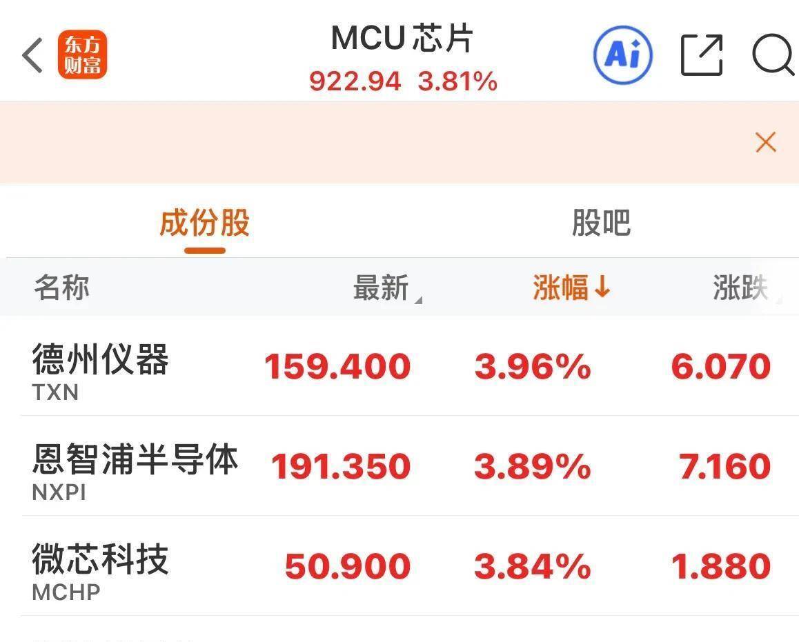 美股暴涨引爆全球市场,A股周一要狂飙100点? 真相藏在这些数据里 | 乐户 | MCU芯片 922.94 3.81% | Ai) | 7 | | --- | --- | --- | --- | | 成份股 | | FF DB | | | 名称 | 最新 | 涨幅↓ | 淵 | | 德州仪器 TXN | 159.400 | 3.96% | 6.07 | | 恩智浦半导体 191.350 NXPI | | 3.89% | 7-1161 | | 微芯科技 MCHP | 50.900 | 3.84% | 1.833 | 地球另一端,美股交易员正在狂欢。 道琼斯指数盘中飙升1.83%,纳斯达克上演V型逆转,早盘还跌0.98%,收盘时竟翻红上涨0.88%。 这种过山车行情,让 熬夜看盘的亚洲投资者直揉眼睛。 芯片股成了最亮眼的明星。 英特尔涨2.62%,德州仪器涨3.96%,整个半导体板块像是打了肾上腺素。 最夸张的是基因编辑概念,单日暴涨超过10%,科幻 电影里的场景正在股市真实上演。 | く 気方 | 欧美指数() | | 7 | | --- | --- | --- | --- | | 名称 | 最新 | 涨幅 | ...