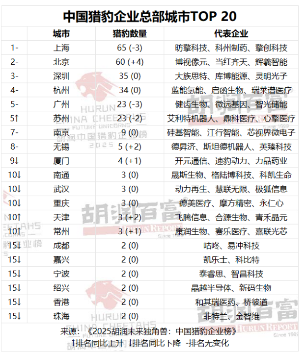 上证报中国证券网讯(记者 宋薇萍)胡润研究院1月26日发布《2025胡润未来独角兽:中国猎豹企业 榜》,榜单列出了成立于2000年之后,五年内(即到2030年底)最有可能达到独角兽级十亿美金估值的 高成长性企业。本次榜单估值计算的截止日期为2025年10月31日。 | | | 中国猎豹企业总部城市TOP 20 | | | --- | --- | --- | --- | | | 城市 | 猎豹数量 | 代表企业 | | 1- | 上海 | 65 (-3) | 防警科技、科州制药、警创科技 | | 2- | 北京 | 60 (+4) | 博视像元、当红齐天、辉羲智能 | | 3- | 深圳 | 35 (0) | 大族思特、库博能源、灵明光子 | | 4- | 杭州 | 34 (0) | 蓝能氢能、启函生物、瑞莱谱医疗 | | 5- | T TH | -111123 -31 | 健齿生物、微远基因、智光储能 | | 51 | | かか INA CHE 23 (-2) | 艾利特机器人、鼎科医疗、心擎医疗 | | 7- | | 南京 中国结 9 (0) @ | 硅基智能、江行智能、芯视界微电子 | | 8- | 尤锡 ...