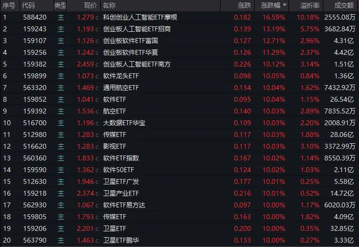 1月12日,A股成交额刷新纪录,行业板块掀起涨停潮。ETF(交易型开放式指数基金)涨幅榜罕 见"封板":27只股票型ETF涨停,5只科创板或创业板相关ETF涨超10%,最牛ETF飙升逾16%。领涨阵 营集中在卫星、传媒、航空、人工智能、软件等主题。 今年以来,商业航天概念持续升温,相关ETF短期涨幅惊人。Wind数据显示,截至1月12日,6只卫 星主题ETF年内涨幅已超30%,领跑全市场;多只航空主题ETF同期涨逾20%。 业内人士提醒,政策与产业利好不断催化相关板块,但面对春季行情的热门赛道,投资者仍需保持 理性,警惕短期概念炒作风险。 20只ETF单日涨超10% Wind数据显示,1月12日全A成交额逾3.6万亿元,超过2024年10月8日的成交额,全市场共有201只 个股涨停。股票型ETF迎来集体大涨。据《国际金融报》记者统计,当日合计共有20只ETF涨幅超过 10%,44只ETF涨幅超过9%,131只ETF涨幅超过5%。 | 序号 | 代码 | 英型 | 现价 名称 | 涨跌 | 涨跌幅▼ | 溢折率 | 成交额 | | --- | --- | --- | --- | --- | --- | --- ...
