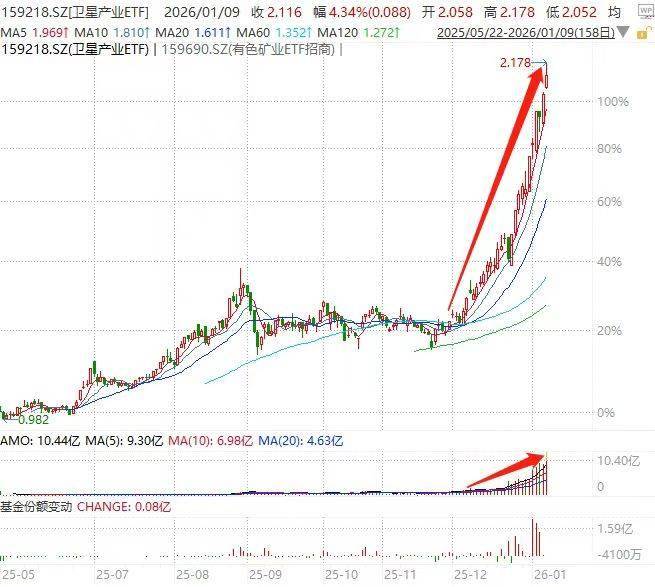 每经记者|李蕾 每经编辑|肖芮冬 《每日经济新闻》记者获悉,2026年以来,被称为"科技小登"的商业航天、卫星等板块持续走强,相关个股掀起涨停潮。截至1月9日午间,中证卫星产业指 数年内涨幅已经超过20%,正在冲击11连阳。 受此带动,卫星主题ETF成为年内领跑全市场ETF的产品。多只产品不仅连续多日上涨、年内涨幅一度超过20%,且强力"吸金"、规模增长可观。 与此同时,跟踪相关指数的ETF年内都收获了可观的涨幅。截至1月9日午间,年内涨幅领先的ETF产品中,前五席均为商业航天和卫星主题ETF,其中还有 不少产品今日早间的年内涨幅一度超过20%。 | 序号 | 代码 | 类型 名称 | 现价 | 涨跌 | 涨跌幅 | 溢折率 | 成交额 | 换手率 | 5E | | --- | --- | --- | --- | --- | --- | --- | --- | --- | --- | | 11 | 512630 | 主 卫星ETF广发 | 1.722 | 0.052 | 3.11% | 0.06% | 4.70亿 | 36.98% | | | 2 | 563530 | 主 卫星ETF易方达 | 1.711 | ...