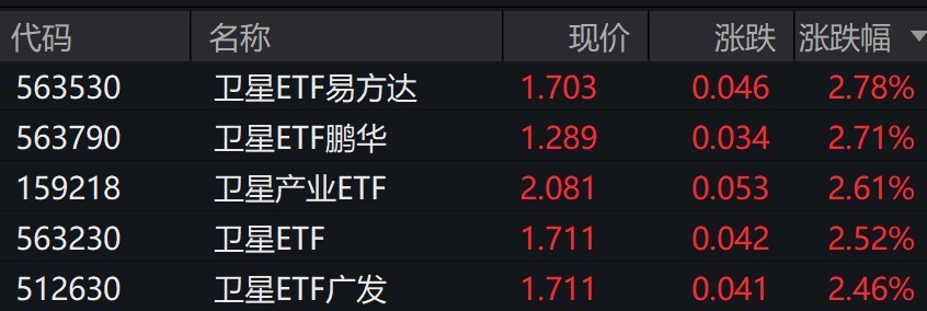 有券商表示,从时间角度看,中国正处于类似Space X 2018-2020年的组网前夜。随着G60千帆与GW国网进入密集发射 期,卫星制造正从实验室定制向汽车流水线式生产转型。能提供通用化电源、通信、姿控系统的配套商将率先兑现业 绩。 (文章来源:每日经济新闻) 卫星概念股早盘走强,航天电子涨停,臻镭科技涨超6%,中国卫星、中科星图、北方导航、北斗星通涨超3%。 受盘面影响,卫星相关ETF涨约4%。 | 代码 | 名称 | 现价 | | 涨跌 涨跌幅 ▼ | | --- | --- | --- | --- | --- | | 563230 | 卫星ETF | 1.644 | 0.065 | 4.12% | | 563530 | 卫星ETF易方达 | 1.635 | 0.060 | 3.81% | | 512630 | 卫星ETF广发 | 1.643 | 0.059 | 3.72% | | 159218 | 卫星产业ETF | 1.999 | 0.071 | 3.68% | | 563790 | 卫星ETF鹏华 | 1.236 | 0.041 | 3.43% | ...