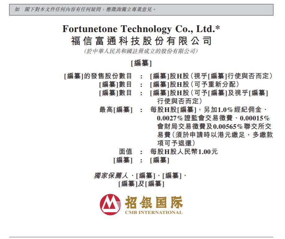 香港聯合交易所有限公司與證券及期貨事務監察委員會對本申請版本的內容概不負責,對其準確性 或完整性亦不發表任何聲明,並明確表示概不就因本申請版本全部或任何部分內容而產生或因倚賴 該等內容而引致的任何損失承擔任何責任。 Fortunetone Technology Co., Ltd.* 福信富通科技股份有限公司 (於中華人民共和國註冊成立的股份有限公司) 的申請版本 警告 本申請版本乃根據香港聯合交易所有限公司(「聯交所」)及證券及期貨事務監察委員會(「證監會」)的 要求而刊發,僅用作提供資料予香港公眾人士。 本申請版本為草擬本,其內所載資料並不完整,亦可能會作出重大變動。 閣下閱覽本文件,即表 示 閣下知悉、接納並向本公司、其獨家保薦人、整體協調人、顧問或包銷團成員表示同意: 本公司招股章程根據香港法例第32章公司(清盤及雜項條文)條例呈交香港公司註冊處處長登記前, 本公司不會向香港公眾人士提出要約或邀請。倘於適當時候向香港公眾人士提出要約或邀請,有意 投資者務請僅依據於香港公司註冊處處長註冊的本公司招股章程作出投資決定。招股章程的文本將 於發售期內向公眾發佈。 * 僅供識別 (a) 本文件僅為向香港公眾人士提 ...