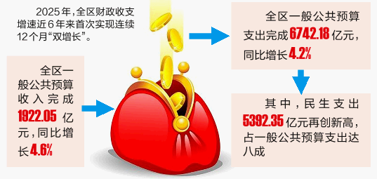 本报讯(记者韩沛)记者1月10日从自治区财政厅获悉,2025年,全区一般公共预算收入完成1922.05亿 元,同比增长4.6%;一般公共预算支出完成6742.18亿元,同比增长4.2%;财政收支增速近6年来首次实 现连续12个月"双增长",为实现"十五五"良好开局奠定坚实基础。 在赋能实体经济方面,全区着力助企减负,为市场经济主体注入"强心剂"。初步统计,2025年现行支持 科技创新和制造业发展的主要政策减税降费及退税超260亿元,全区行政事业性收费收入同比下降 13.9%,市场活力得到充分激发。加力落实金融惠企三年行动计划,2025年1—11月,推动投放惠企贴 息贷款超1151亿元、惠及经营主体超4.4万户,降低经营主体融资成本超12亿元,补贴融资担保业务超 27亿元、惠及经营主体近1200户,助力企业纾困发展。此外,通过广西政府投资引导基金推动重点优势 产业基本实现"一链一基金",各子基金投资或引入广西区内企业147家,其中高新技术企业45家、专精 特新小企业34家、瞪羚企业6家。 聚力推动科技创新,广西制定11条政策措施,力争每年安排150亿元、3年累计安排近450亿元支持发展 新质生产力。安排数字广西 ...