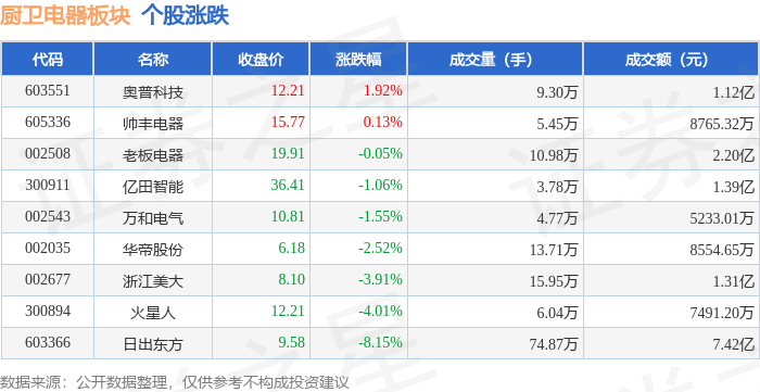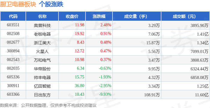 从资金流向上来看,当日厨卫电器板块主力资金净流出1.23亿元,游资资金净流入2163.6万元,散户资金 净流入1.01亿元。厨卫电器板块个股资金流向见下表: 证券之星消息,11月20日厨卫电器板块较上一交易日下跌1.4%,日出东方领跌。当日上证指数报收于 3931.05,下跌0.4%。深证成指报收于12980.82,下跌0.76%。厨卫电器板块个股涨跌见下表: | 代码 | 名称 | 收盘价 | 涨跌幅 | 成交量(手) | 成交额(元) | | --- | --- | --- | --- | --- | --- | | 603551 | 奧普科技 | 11.98 | 2.48% | 3.29万 | 3895.90万 | | 002508 | 老板电器 | 19.92 | 0.91% | 7.06万 | + 1.41亿 | | 002677 | 浙江美大 | 8.43 | 0.48% | 15.87万 | 1.34亿 | | 300894 | 火星人 ▼ | 12.72 | 0.47% | - 5.56万 | 7099.01万 | | 002543 | 万和电气 | 10.98 | 0.37% | 3.47万 ...