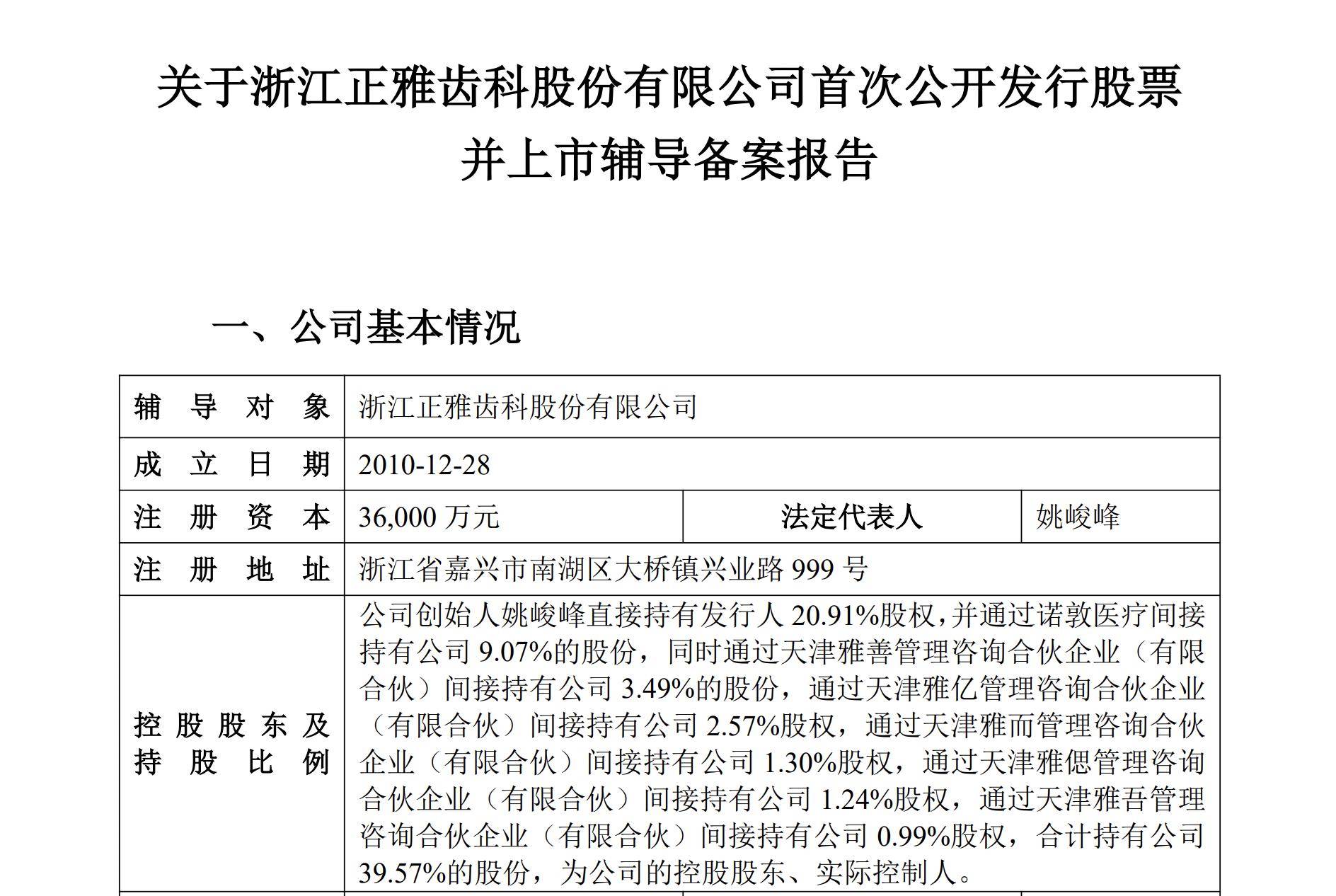 证监会网站披露,浙江正雅齿科股份有限公司于2026年2月25日在浙江证监局办理辅导备案登记,拟首 次公开发行股票并上市,辅导券商为中信建投证券。辅导备案报告显示,公司创始人姚峻峰直接持有公 司20.91%股权,并通过诺敦医疗间接持有公司9.07%的股份,同时通过天津雅善管理咨询合伙企业(有 限合伙)间接持有公司3.49%的股份,通过天津雅亿管理咨询合伙企业(有限合伙)间接持有公司 2.57%股权,通过天津雅而管理咨询合伙企业(有限合伙)间接持有公司1.30%股权,通过天津雅偲管 理咨询合伙企业(有限合伙)间接持有公司1.24%股权,通过天津雅吾管理咨询合伙企业(有限合伙) 间接持有公司0.99%股权,合计持有公司39.57%的股份,为公司的控股股东、实际控制人。 ...