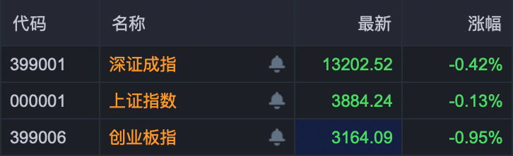 12月15日,A股三大指数集体低开。 | 代码 | 名称 | 最新 | 涨幅 | | --- | --- | --- | --- | | 399001 | 深证成指 | 13202.52 | -0.42% | | 000001 | 上证指数 | 3884.24 | -0.13% | | 399006 | 创业板指 | 3164.09 | -0.95% | 盘面上,白酒概念、可控核聚变概念、食品饮料、工程机械等板块涨幅居前;CPO概念、锂矿概念、芯片概念、有色金属、房地产等板块跌幅居前。 港股方面,恒生指数和恒生科技指数大幅低开。阿里巴巴、腾讯控股、小米集团、快手等均有不同幅度下跌。港股黄金股走强,截至发稿,紫金黄金国际 涨近6%,赤峰黄金(600988)涨近5%,潼关黄金涨近3%,灵宝黄金涨近2%。 | 名称 | 现价 | 涨跌 | 涨跌幅 | | --- | --- | --- | --- | | 恒生指数 | 25751.99c | -224.80 | -0.87% | | 恒生科技 | 5541.71c | -96.34 | -1.71% | 商业航天概念延续强势 盘初,商业航天概念股走强。顺灏股份(0 ...