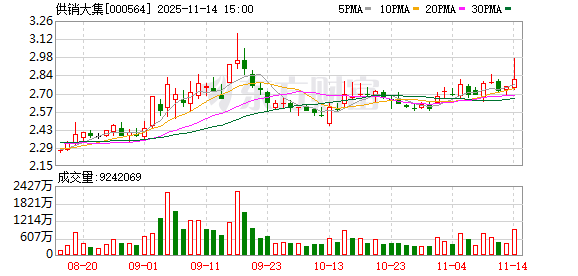 供销大集11月14日大宗交易平台出现一笔成交,成交量33.60万股,成交金额94.42万元,大宗交易成交 价为2.81元。该笔交易的买方营业部为中国国际金融股份有限公司深圳分公司,卖方营业部为机构专 用。 进一步统计,近3个月内该股累计发生6笔大宗交易,合计成交金额为1701.68万元。 据天眼查APP显示,供销大集集团股份有限公司成立于1996年12月05日,注册资本1805806.3354万人民 币。(数据宝) 11月14日供销大集大宗交易一览 | 成交量(万 | 成交金额 | 成交价格 | 相对当日收盘折溢 | 买方营业部 | 卖方营 | | --- | --- | --- | --- | --- | --- | | 股) | (万元) | (元) | 价(%) | | 业部 | | 33.60 | 94.42 | 2.81 | 0.00 | 中国国际金融股份有限公司 | 机构专 | | | | | | 深圳分公司 | 用 | (文章来源:证券时报网) 证券时报·数据宝统计显示,供销大集今日收盘价为2.81元,上涨1.81%,日换手率为6.28%,成交额为 26.30亿元,全天主力资金净流入1.75亿元 ...