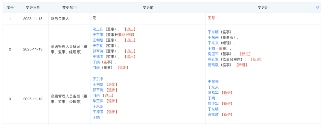 | 序号 | | 姓名 | 职务 | 持股比例 | 个人简介 | | --- | --- | --- | --- | --- | --- | | 1 | チ | 于东来 834 法定代表人 受益所有人▸ 实际控制人》 控股股东 | 董事长,董事,总经理 | 69.9647% O | 详情 | | 2 | + | 于娟 | 重事 | 5.3004% O | | | ദ | 房 | 房亚军 | 夏宝 | 5.3004% O | | | ব | 营 | 管凯歌 ぽ2 | 际金 | | | | 5 | 冯 | 冯延军 怒2 | 监事 | | | | 6 | + | 于东明 | 版章 | 5.3004% 0 | | 胖东来主要人员情况 图片来源:天眼查 | | 序号 变更日期 | 变更项目 | 变更前 | 变更后 | > | | --- | --- | --- | --- | --- | --- | | 1 | 2025-11-13 | 财务负责人 | 元 | 王慧 | | | 2 | 2025-11-13 | 高级管理人员备案(董 | 常玉庆(董事), 【退出】 于东来(董事长兼总经理), 王利增(董事), 【退出】 ...