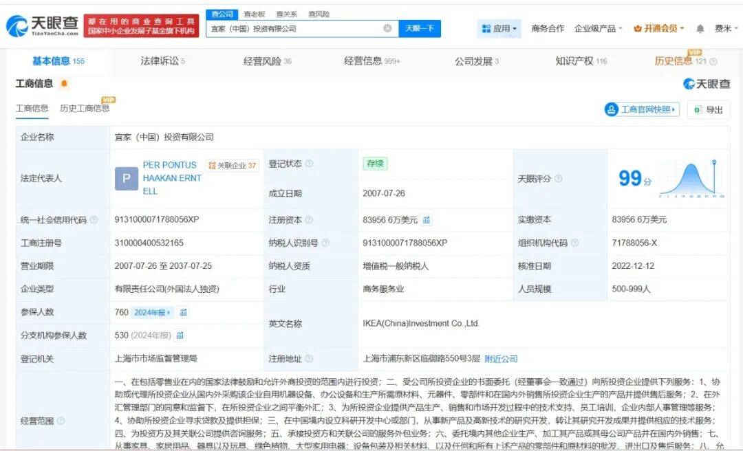 据媒体报道,1月7日中午,"宜家中国资讯中心"发文宣布,将于2026年2月2日起停止运营上海宝山、广州番禺、天津中北、南通、徐州、宁波及哈尔滨的 7家商场。公司称此举为优化渠道布局、构建业务韧性。 天眼查工商信息显示,宜家(中国)投资有限公司成立于2007年7月,法定代表人为PER PONTUS HAAKAN ERNTELL,注册资本约8.4亿美元,经营范围 包括在包括零售业在内的国家法律鼓励和允许外商投资的范围内进行投资等。股东信息显示,该公司由INGKA PRO HOLDING B.V.全资持股。对外投资 信息显示,该公司对外投资42家企业,其中39家处于存续状态,长春宜家家居有限公司、宜家家具配件(深圳)有限公司、北京宜家咨询有限公司已注 销。 对外投资信息显示,该公司对外投资42家企业,其中39家处于存续状态 投资时间网、标点财经快讯 | | 章公司 查老板 那在用的窗业资讯 | | 营网投 营关系 | | | | | --- | --- | --- | --- | --- | --- | --- | | | | 宣家(中国) 投资有限公司 能应用 - 商务合作 企业级产品, ★ 开通会员 · | ത ...