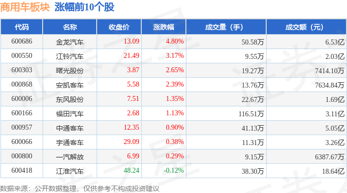 证券之星消息,10月20日商用车板块较上一交易日上涨0.3%,金龙汽车领涨。当日上证指数报收于 3863.89,上涨0.63%。深证成指报收于12813.21,上涨0.98%。商用车板块个股涨跌见下表: 以上内容为证券之星据公开信息整理,由AI算法生成(网信算备310104345710301240019号),不构成投资建议。 | 代码 | 名称 | 收盘价 | 涨跌幅 | 成交量(手) | 成交额(元) | | --- | --- | --- | --- | --- | --- | | 600375 | 汉马科技 | 7.70 | -5.06% | 90.77万 | 7.10亿 | | 301039 | 中集车辆 | 9.54 | -1.14% | 10.55万 | + 1.01亿 | | 000951 | 中国重汽 | 17.58 | -0.45% | 13.49万 | 2.37 Z | | 600418 | 江淮汽车 | 48.24 | -0.12% | 1 38.30万 | 18.64亿 | | 000800 | 一汽解放 | 6.99 | 0.29% | 9.15万 | 6387.67万 | | 60 ...