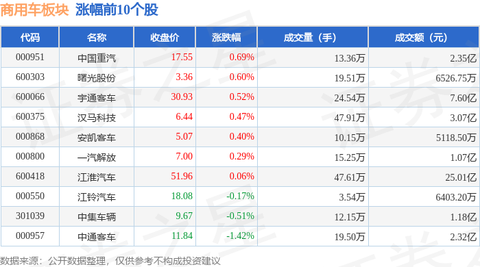 证券之星消息,1月23日商用车板块较上一交易日下跌0.21%,金龙汽车领跌。当日上证指数报收于 4136.16,上涨0.33%。深证成指报收于14439.66,上涨0.79%。商用车板块个股涨跌见下表: | 代码 | 名称 | 收盘价 | 涨跌幅 | 成交量(手) | 成交额(元) | | | --- | --- | --- | --- | --- | --- | --- | | 000951 | 中国重汽 | 17.55 | 0.69% | 13.36万 | | 2.35亿 | | 600303 | 曙光股份 | 3.36 | 0.60% | 19.51万 | | 6526.75万 | | 600066 | 宇通客车 | 30.93 | 0.52% | 24.54万 | | 7.60亿 | | 600375 | 汉马科技 | 6.44 | 0.47% | 47.91万 | | 3.07亿 | | 000868 | 安凯客车 | 5.07 | 0.40% | 10.15万 | | 5118.50万 | | 000800 | 一汽解放 | 7.00 | 0.29% | 15.25万 | | 1.07亿 | | ...