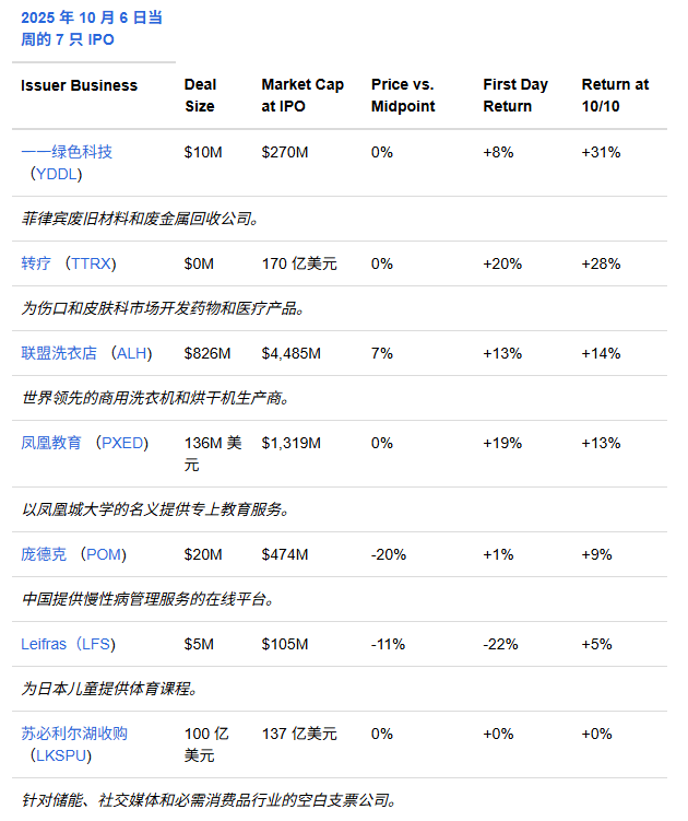 来源:美股研究社 本周美国 IPO 市场活跃度较高,尽管面临宏观不确定性,发行方仍积极调整策略推进上市进程。本周共 有 6 家企业通过传统 IPO 上市、2 家特殊目的收购公司(SPAC)挂牌;同时,13 家企业与 5 家 SPAC 提 交了首次上市申请。 商业洗衣机制造商Alliance Laundry Holdings(ALH) 此次 IPO 扩大了发行规模,且定价位于发行区间上 限,最终募资 8.26 亿美元,市值达 45 亿美元。该公司 2015 年被 BDT 资本伙伴公司收购,核心产品是 商用洗衣系统,应用于医疗设施、酒店、自助洗衣店、消防站等机构场景,在北美商用洗衣市场的份额 约为 40%。截至本周收盘,其股价上涨 14%。 高等教育机构菲尼克斯教育伙伴公司(Phoenix Education Partners,PXED) 以发行区间中点定价,募资 1.36 亿美元,市值 13 亿美元。该公司通过菲尼克斯大学提供高等教育服务,主要面向希望提升职业竞争 力的在职成年人,开设了 72 个学位授予项目与 33 个非学位证书项目,覆盖多个学科领域。本周该股收 涨 13%。 中国在线医疗平台平安好医生(Po ...
