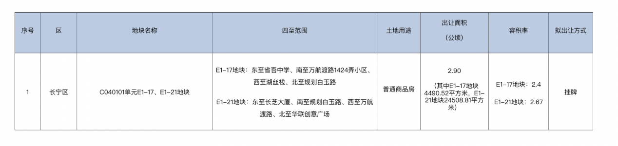 上海进深 刘治颖 2月25日,上海土地交易市场披露2026年第二批次土拍公告。根据公告,仅有1幅宅地出让,位于长宁区中山公园板块。其拟于2026年2月底 发布本次住宅用地出让公告,2026年3月底交易。 | 序号 | 区 | 地块名称 | 四至范围 | 土地用途 | 出让面积 | 容积率 | | --- | --- | --- | --- | --- | --- | --- | | | | | | | (公顷) | | | | 长宁区 | C040101单元E1-17、E1-21地块 | E1-17地块:东至省吾中学、南至万航渡路1424弄小区、 | 普通商品房 | 2.90 | | | | | | 西至湖丝栈、北至规划白玉路 | | (其中E1-17地块 | E1-17地块:2 | | | | | | | 4490.52平方米, E1- | | | | | | E1-21地块:东至长芝大厦、南至规划白玉路、西至万航 | | 21地块24508.81平方 | E1-21地块:2 | | | | | 渡路、北至华联创意广场 | | 米) | | 该宅地出让面积为2.90公顷,其中E1-17地块4490.52平方 ...