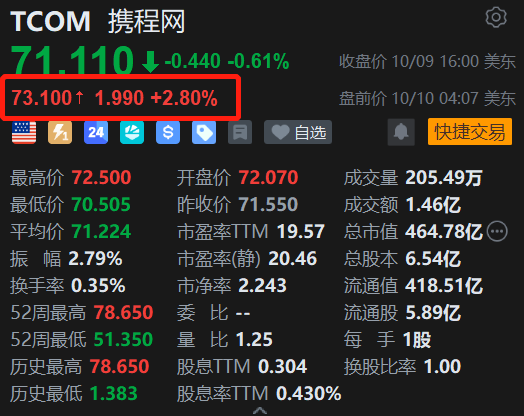 | TCOM 携程网 | | | | --- | --- | --- | | 71.110 ↓-0.440 -0.61% | | 收盘价 10/09 16:00 美东 | | 73.100↑ 1.990 +2.80% | | 盘前价 10/10 04:07 美东 | | 三 7 24 字 S 9 日 ♥ 白 ♥ 白 一 白 一 白 一 白 一 白 | | ● 快捷交易 | | 最高价 72.500 | 开盘价 72.070 | 成交量 205.49万 | | 最低价 70.505 | 昨收价 71.550 | 成交额 1.46亿 | | 平均价 71.224 | 市盈率 M 19.57 | 总市值 464.78亿 (…) | | 振 幅 2.79% | 市盈率(静) 20.46 | 总股本 6.54亿 | | 换手率 0.35% | 市净率 2.243 | 流通值 418.51亿 | | 52周最高 78.650 | 委 比 -- | 流通股 5.89亿 | | 52周最低 51.350 | 量 比 1.25 | 色 手 1股 | | 历史最高 78.650 | 股息TTM 0.304 换股比率 1.00 | ...