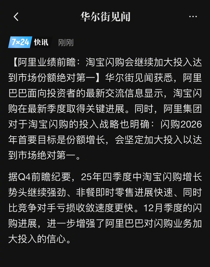 据Q4前瞻纪要,25年四季度中淘宝闪购增长 势头继续强劲、非餐即时零售进展快速、同时 比竞争对手亏损收敛速度更快。12月季度的闪 购进展,进一步增强了阿里巴巴对闪购业务加 大投入的信心。 财48网|微博 63 @财经网 7×24 快讯 刚刚 【阿里业绩前瞻: 淘宝闪购会继续加大投入达 到市场份额绝对第一】华尔街见闻获悉,阿里 巴巴面向投资者的最新交流信息显示,淘宝闪 购在最新季度取得关键进展。同时,阿里集团 对于淘宝闪购的投入战略也明确: 闪购2026 年首要目标是份额增长,会坚定加大投入以达 到市场绝对第一。 #淘宝闪购要达到市场份额绝对第一#【阿里业绩前瞻:#淘宝闪购会继续加大投入达到市场份额绝对第 一#[思考]】华尔街见闻获悉,阿里巴巴面向投资者的最新交流信息显示,淘宝闪购在最新季度取得关 键进展。同时,阿里集团对于淘宝闪购的投入战略也明确:闪购2026年首要目标是份额增长,会坚定加 大投入以达到市场绝对第一。 据Q4前瞻纪要,25年四季度中淘宝闪购增长势头继续强劲、非餐即时零售进展快速、同时比竞争对手 亏损收敛速度更快。12月季度的闪购进展,进一步增强了阿里巴巴对闪购业务加大投入的信心。(华尔 街见闻 ...