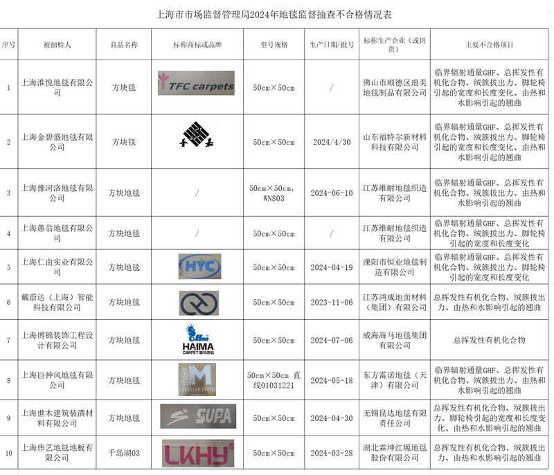新京报讯(记者张洁)4月8日,新京报记者从上海市市场监督管理局官网获悉,在近期对地毯等4类产品的监督抽 查中,发现10批次地毯产品不合格,不合格检出率为40%。不合格产品的生产企业涉及佛山市顺德区琅美地毯制 品有限公司、山东福特尔新材料科技有限公司等。 不合格名单显示,标称佛山市顺德区琅美地毯制品有限公司生产的方块毯(型号规格50cm×50cm)、标称山东福 特尔新材料科技有限公司生产的方块毯(型号规格50cm×50cm;生产日期/批号2024-04-30)的主要不合格项目均 为临界辐射通量GHF、总挥发性有机化合物、绒簇拔出力、脚轮椅引起的宽度和长度变化、由热和水影响引起的 翘曲项目。据介绍,总挥发性有机化合物(TVOC)不合格不仅影响人体健康,还对室内环境造成长期的不良影 响。长期接触VOC超标的地毯,可能导致人体免疫系统失调、中枢神经系统受损、肝脏和肾脏损伤等风险。临界 热辐射通量CHF不合格,地毯有较快的火源引燃能力和蔓延能力,一旦发生火灾,可能迅速燃烧并蔓延,增加火 灾的严重性和危险性。 | 序号 | 被抽检人 | 商品名称 | 标标商标或品牌 | 型号规格 | 生产日期/批号 | 标称生产企业(或 ...