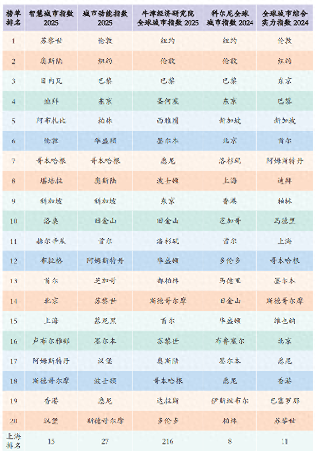 研究发现,上海在经济基础、人力资本、交通枢纽、数字化建设与科技创新方面表现亮眼,但在宜居 性、绿色低碳、社会包容性与治理效能等"软支撑"维度仍有提升空间。研究为城市管理者提供了全球参 照体系下优化城市功能、提升全球竞争力的实证支撑与决策参考。 表1 五大榜单最新排名情况(TOP20) | 榜单 | 智慧城市指数 | 城市动能指数 | 牛津经济研究院 | 科尔尼全球 | 全球城市综合 | | --- | --- | --- | --- | --- | --- | | 排名 | 2025 | 2025 | 全球城市指数 2025 | 域市指数 2024 | 实力指数 2024 | | -1 | 苏黎世 | 伦敦 | 纽约 | 细约 | 伦敦 | | 2 | 奥斯陆 | 纽约 | 伦敦 | 伦敦 | 纽约 | | 3 | 目内瓦 | 巴黎 | 巴黎 | 巴黎 | 东京 | | র্বা | 通拜 | 东京 | 圣何塞 | 东京 | 巴黎 | | 5 | 阿布扎比 | 柏林 | 西雅图 | 新加坡 | 新加坡 | | 6 | 伦敦 | 华盛顿 | 墨尔本 | 北京 | 商尔 | | 7 | 哥本哈根 | 哥本哈根 | ...