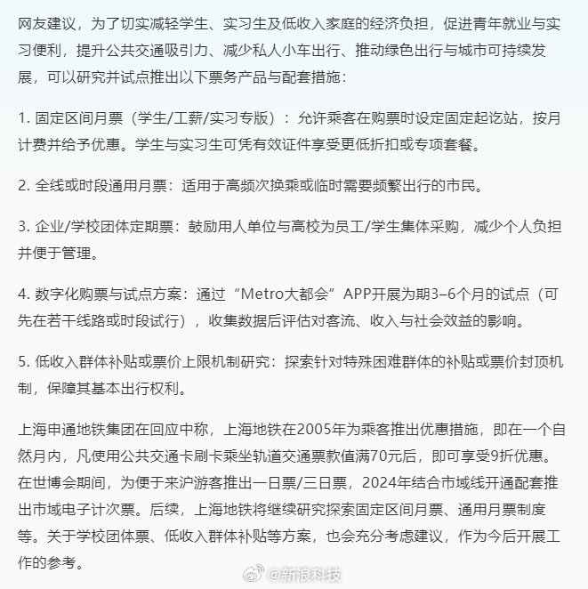 【#网友建议上海地铁推出月票制度#】#申通地铁回应建议上海地铁推月票制度# 近日,有网友在人民 网"领导留言板"留言,希望上海地铁推出月票制度。上海申通地铁集团有限公司答复表示,上海地铁后 续将继续研究探索固定区间月票、通用月票制度等。关于学校团体票、低收入群体补贴等方案,也会作 为后续开展工作的参考。 该网友提出,目前上海地铁采用按里程计价制度,尚无月票或定期通勤票。这对于固定区间通勤的上班 族而言影响明显,同时也更应关注学生、实习生、低收入者(含新入职的见习/实习人员及兼职工作 者)的出行负担。此类群体收入有限、出行频次稳定或受校企安排影响往返特定区间,长期交通成本在 其生活与学习支出中占比较高,已成为制约其学习实习、就业以及日常生活质量的重要因素。(智通财 经) ...