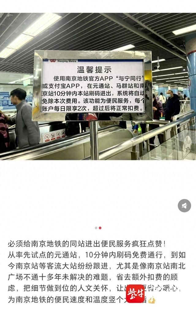 转自:扬子晚报 扬子晚报网1月10日讯(记者 姜婧仪)近日,南京地铁元通站试行10分钟内进出免费引起市民关注。记 者注意到,除了元通站,还有马群站、南京站也同步试行。 在元通站的,一个温馨提示的指示牌上写着:使用南京地铁官方APP"与宁同行"或支付宝APP,在元通 站,马群站和南京站10分钟内本站刷码进出,系统将自动免除本次费用。该功能为便民服务,每个账户 每日限享2次,超过后将正常扣费。 记者注意到,元通站、马群站、南京站都是客流较大的换乘枢纽,出入口较多,且都存在出口之间站内 没有免费过街通道的问题。这就意味着,如果出错了出口,可能得重新刷码进站。 作为南京地铁2号线与10号线的换乘枢纽,元通站位处河西大街与江东中路交叉口,周边环绕着南京国 际博览中心、华采天地、南京ifc商场、金源河西商业广场、河西中央公园等多个地标性建筑。加上最 近刚投入使用的7号、8号、9A、9B出入口,一共有10个出入口。而1号口与6号口、2号口与北侧5号口 还未实现对接,此次试行10分钟内本站刷码进出,这让乘客乘行更加方便。 马群地铁站是南京东郊最大的换乘中心,地铁、公交、有轨电车都在这里无缝换乘。由于1号口、3号口 与2号口、 ...