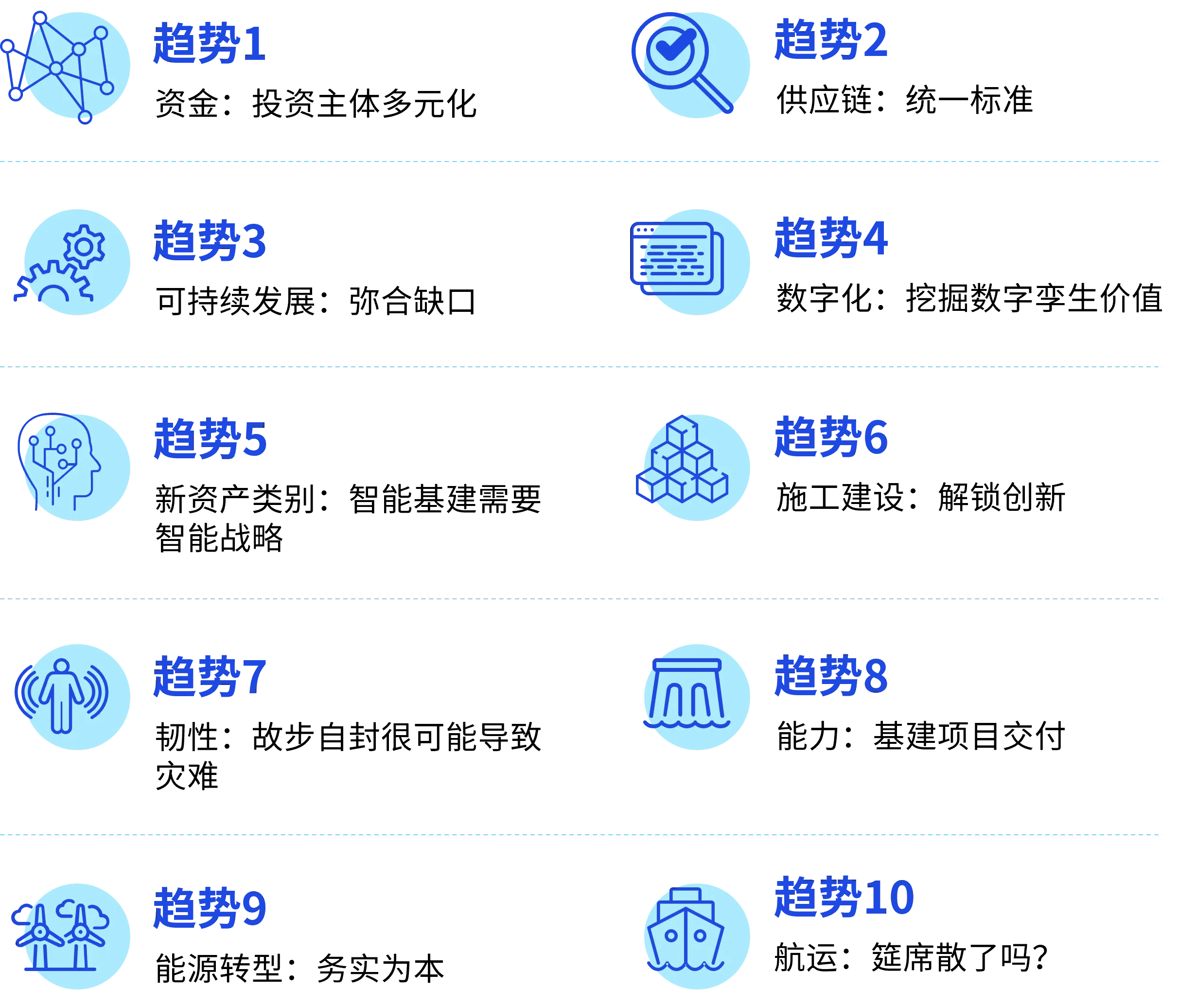 毕马威近日重磅发布《大变局:基建与交通运输行业新兴趋势》报告,深入解析当前行业面临的重大变革。《大变局:基建与交通运输行业新兴趋势》报告 基于全球十位基建领域资深负责人的实践洞见,并从各自的专业视角深入解读了全球变局对行业的深远影响。报告不仅包含了对现状的深刻分析,还提供了 对未来发展的前瞻性预测。我们相信,报告将为未来一年的基建行业发展提供重要指引。 核心判断: 2025年,随着公债收益率上升、双边投资撤退及美元走强等因素加剧财政压力,各国将激烈竞争以争夺耐心资本,推动私人投资和多元化的投资主体成为关 键趋势。 2025年关键演进: 2025年将会发生大范围的变革。部分国家的公债收益率上升将增加政府的资金成本。同时,我们看到双边投资和开发援助正在撤退。这进一步削弱了新兴市 场的财政能力。对于进行本币投资的政府来说,美元走强加剧了财务困境。同时,随着公民要求政府迅速取得施政成效,提供更具韧性的基建和更现代化的 服务,今年新基建的需求可能会激增。对于许多国家而言,是否有能力满足这些期望,将是确保未来社会和经济稳定的关键。 预测和建议: 今年,各国将激烈竞争以争夺耐心资本。一些国家将效仿印度设立国家资产货币化管道 ...