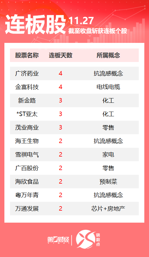 | | 连板服設 11.27 11.27 | | | --- | --- | --- | | 股票名称 | 连板天数 | 所属概念 | | 广济药业 | 4 | 抗流感概念 | | 金富科技 | 4 | 电线电缆 | | 新金路 | 3 | 化工 | | *ST亚太 | 3 | 化工 | | 茂业商业 | 3 | 零售 | | 海王生物 | 2 | 抗流感概念 | | 雪祺电气 | 2 | 家电 | | 广百股份 | 2 | 零售 | | 海欣食品 | 2 | 预制菜 | | 粤万年青 | 2 | 抗流感概念 | | 万通发展 | 2 | 芯片+房地产 | 抗流感概念股广济药业4连板,零售股茂业商业3连板。一图速览今日连板股>> 11月27日,Wind数据显示,A股市场共计63只个股涨停。其中抗流感概念股广济药业收获4连板,粤万 年青、海王生物2连板;零售股茂业商业3连板。一图速览今日连板股>> ...