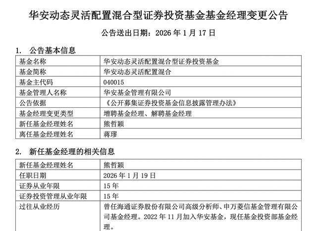 瑞财经 吴文婷近日,华安基金发布公告,基金经理蒋璆以"个人原因"为由,"清仓式"卸任其管理的全部9只基金,并且不再转任公司其他岗位。 | 新任基金经理姓名 | 熊哲颖 | | --- | --- | | 任职目期 | 2026年1月19日 | | 证券从业年限 | 15年 | | 证券投资管理从业年限 | 15年 | | 过往从业经历 | 曾任海通证券股份有限公司高级分析师、申万菱信基金管理有限公 | | | 司基金经理。2022年11月加入华安基金,现任基金投资部基金经 | | | 理。 | | 离任基金经理姓名 | 蒋罗 | | --- | --- | | 离任原因 | 个人原因 | | 离任日期 | 2026年1月19日 | | 转任本公司其他工作岗位 | 无 | | 的说明 | | | 是否已按规定在中国基金 | 是 | | 业协会办理注销手续 | | 据媒体报道,从业内获悉,蒋璆下一站或将前往私募。 作为一位拥有"双十"(任职超十年、年化收益超10%)光环的老将,蒋璆曾是华安基金权益投资的核心力量。 | 基金名称 | 华安动态灵活配置混合型证券投资基金 | | --- | --- | | 基金简称 ...