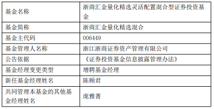中国经济网北京1月30日讯 昨日,浙商证券资产管理有限公司公告,浙商汇金量化精选混合增聘陈 顾君。 浙商汇金量化精选混合A/C成立于2019年03月25日和2025年09月30日,截至2026年01月29日,其今 年来收益率为2.50%、2.47%,成立来收益率为71.29%、2.46%,累计净值为1.7129元、1.7110元。 | 基金名称 | 浙商汇金量化精选灵活配置混合型证券投资基 | | --- | --- | | | 金 | | 基金简称 | 浙商汇金量化精选混合 | | 基金主代码 | 006449 | | 基金管理人名称 | 浙江浙商证券资产管理有限公司 | | 公告依据 | 《证券投资基金信息披露管理办法》 | | 基金经理变更类型 | 增聘基金经理 | | 新任基金经理姓名 | 陈顾君 | | 共同管理本基金的其他基 | 庞雅菁 | | 金经理姓名 | | (责任编辑:康博) 陈顾君历任上海海通证券资产管理有限公司量化研究员,曾任浙江浙商证券资产管理有限公司量化 研究员、基金经理助理,现任基金经理。 ...