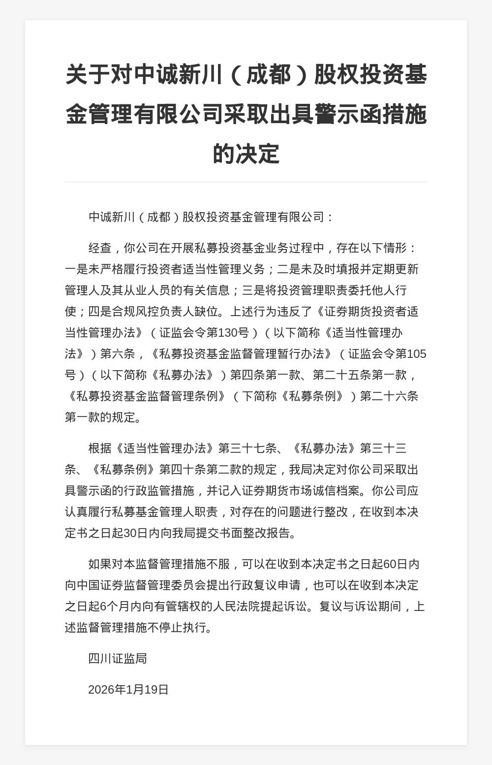 蓝鲸新闻1月30日讯,近日,四川证监局发布行政监管措施决定书,剑指中诚新川(成都)股权投资基金管理有限公司。 决定书显示,中诚新川(成都)股权投资基金管理有限公司在开展私募投资基金业务过程中,存在以下情形:一是未严格履行投资者适当性管 理义务;二是未及时填报并定期更新管理人及其从业人员的有关信息;三是将投资管理职责委托他人行使;四是合规风控负责人缺位。 上述行为违反了《证券期货投资者适当性管理办法》《私募投资基金监督管理暂行办法》《私募投资基金监督管理条例》的规定。 对此,四川证监局决定对中诚新川(成都)股权投资基金管理有限公司采取出具警示函的行政监管措施,并记入证券期货市场诚信档案。 ... 四川证监局 2026年1月19日 ...