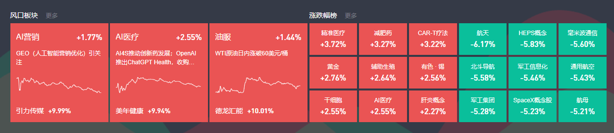 一、行情回顾 市场全天震荡调整,盘面上,主线商业航天出现大分歧,中国卫通、航天科技等多股跌停;AI应用则顺势加强后分歧,AI医疗、AI制药表现突出,美年健 康、泓博医药、博济医药、兰卫医学等集体涨停;受益于主线分歧,今日盘中多个板块出现异动,油气股、消费、锂电等板块早盘盘中拉升,无人驾驶、变 压器午盘拉升。个股跌多涨少,沪深京三市约3700股飘绿,今日成交3.7万亿,再次刷新历史记录。截止收盘沪指跌0.64%,深成指跌1.37%,创业板指跌 1.96%。 | 风口板块 更多 | | | | | | 涨跌幅榜 更多 | | | | | | --- | --- | --- | --- | --- | --- | --- | --- | --- | --- | --- | | Al营销 | +1.77% | Al医疗 | +2.55% | 油服 | +1.44% | 精准医疗 +3.72% | 减肥药 +3.27% | CAR-T疗法 +3.22% | 航天 -6.17% | HEPS概念 -5.83% | | GEO (人工智能营销优化) 引关 | | AI4S推动创新药发展;OpenAl | | WTI原油日内 ...