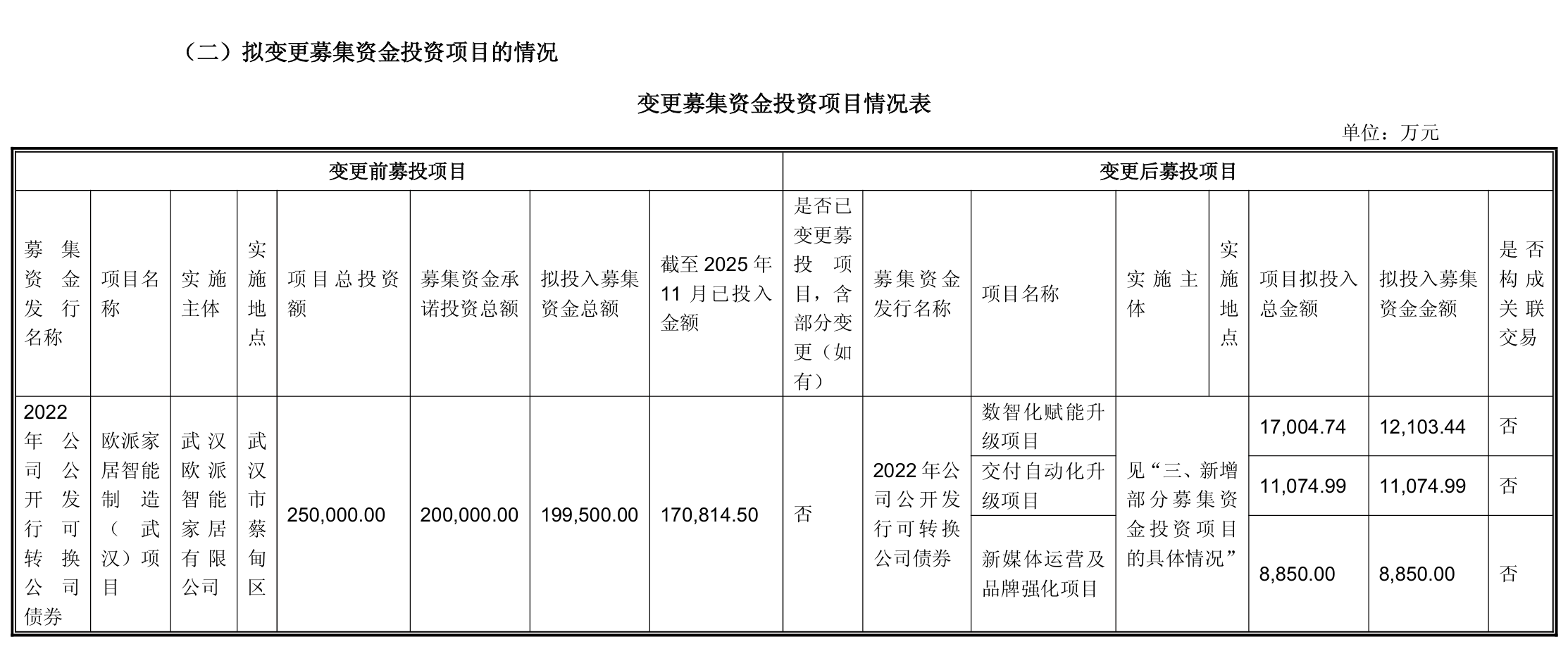 1月6日,欧派家居发布变更募投项目投资方向项目公告,原募投项目欧派家居智能制造(武汉)项目剩余资金将用于投资新项目。 | | | | | | 变更前募投项目 | | | | | --- | --- | --- | --- | --- | --- | --- | --- | --- | | 募 | 集 | | | 实 | | | | 截至 2025 年 | | 资 | 金 | 项目名 | 实施 | 施 | 项目总投资 | 募集资金承 | 拟投入募集 | 11 月已投入 | | 发 行 | | 称 | 主体 | ਮੋ | 额 | 诺投资总额 | 资金总额 | 金额 | | 名称 | | | | 点 | | | | | | 2022 | | | | | | | | | | 生 | 公 | 欧派家 | 武汉 | 武 | | | | | | 司 | 公 | 居智能 | 欧 派 | 汉 | | | | | | チ | 发 | 制 造 | 智能 | 市 | | | | | | 行 | 可 | ( 武 | 家居 | 蔡 | 250,000.00 | 200,000.00 | 199,500.00 | 170.814.50 | ...
