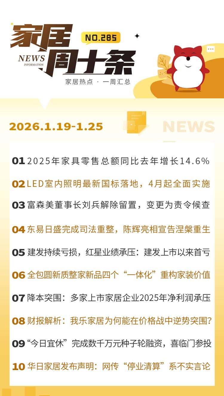 家居周十条 | 2025年家具零售总额增长14.6%、富森美董事长刘兵解除留置、多家上市家居企业2025年净利润承压 …